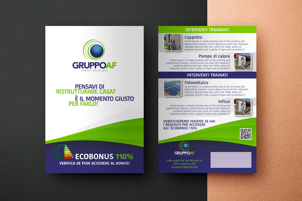 Ho curato la realizzazione del logo, della brand image e del materiale promozionale per Gruppo AF, una società specializzata in efficientamento energetico.